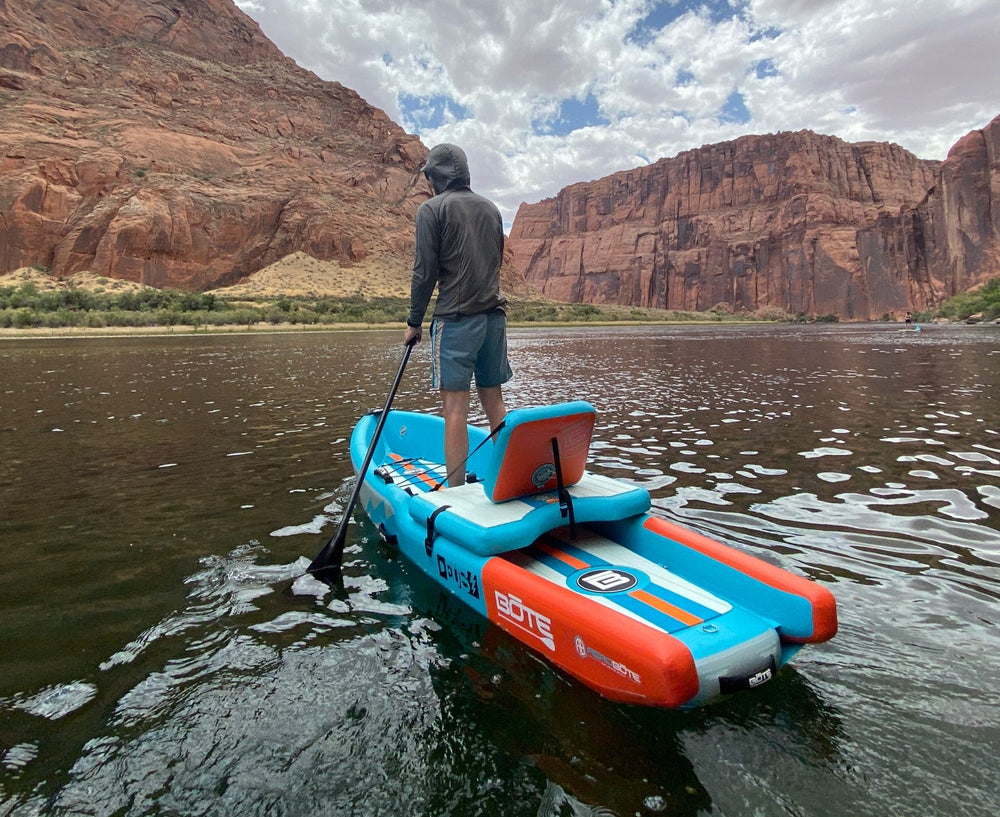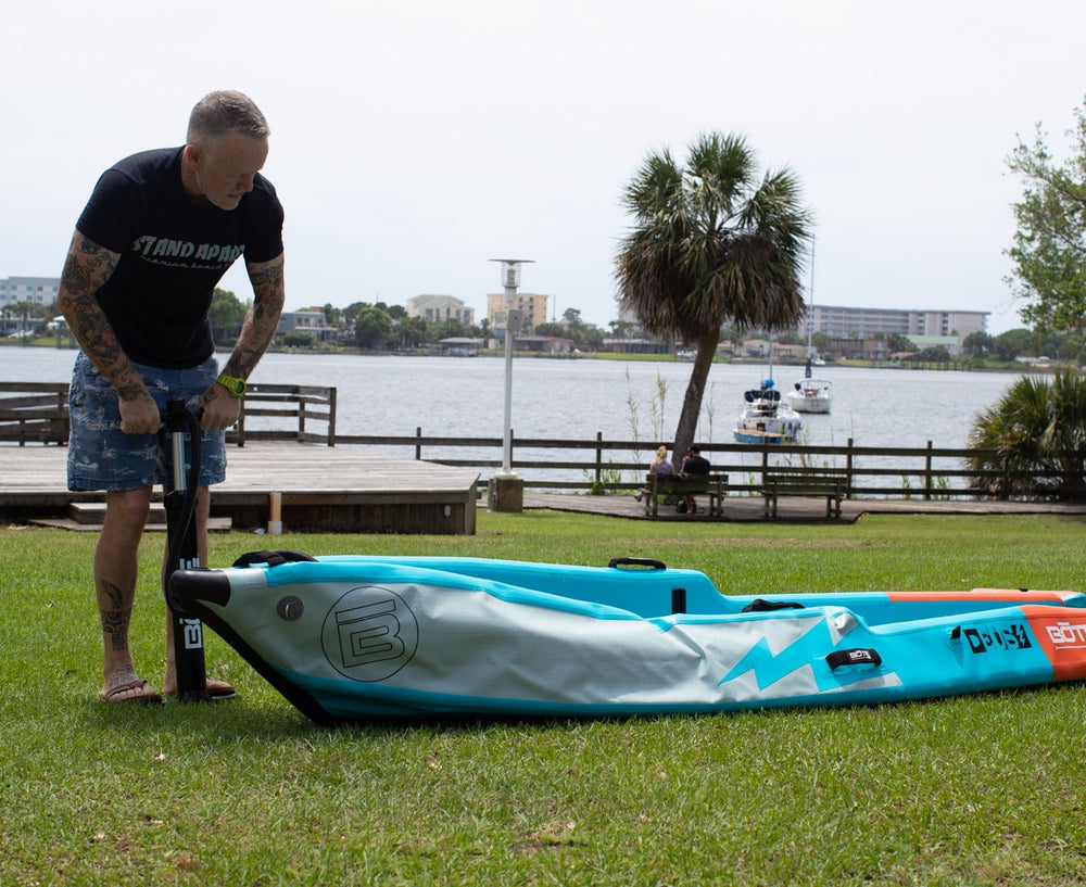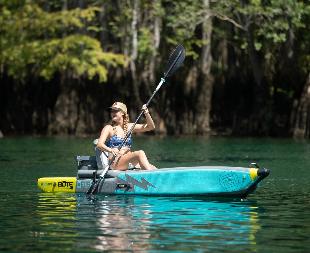The one-of-a-kind BOTE DEUS [day-us] recreational inflatable kayak enters the kayak category with no rival. Utilizing industry-shaping design and engineering, this versatile recreational kayak is constructed with BOTE’s inflatable AeroULTRA Technology and goes from travel bag to a 11’ sit-on-top kayak in a matter of minutes. Remove the top chamber and it becomes a super stable stand up paddle board in seconds. The military grade PVC construction makes the DEUS incredibly lightweight as well as super easy to store and transport.
