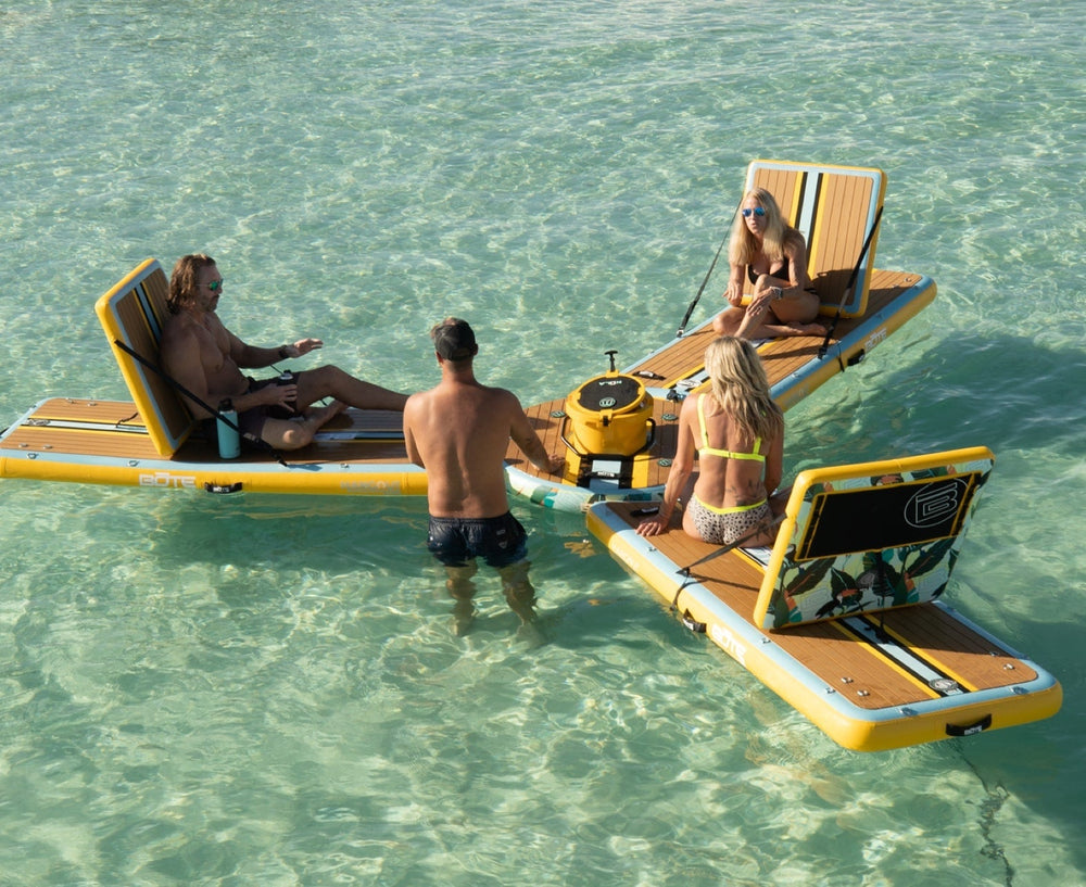 If you’ve seen any pool ever with the chaise lounge chairs on the side of the pool, this is a floating version of that. The patent pending Hangout Lounge is the next-level evolution of our original Dock FX. To enhance it, we added a removable and adjustable (and reclinable!) seatback to allow you to treat it like a lounge chair on the water. We also added a grooved shape at the foot of the raft to allow it to pair up seamlessly with a Hangout Bar.